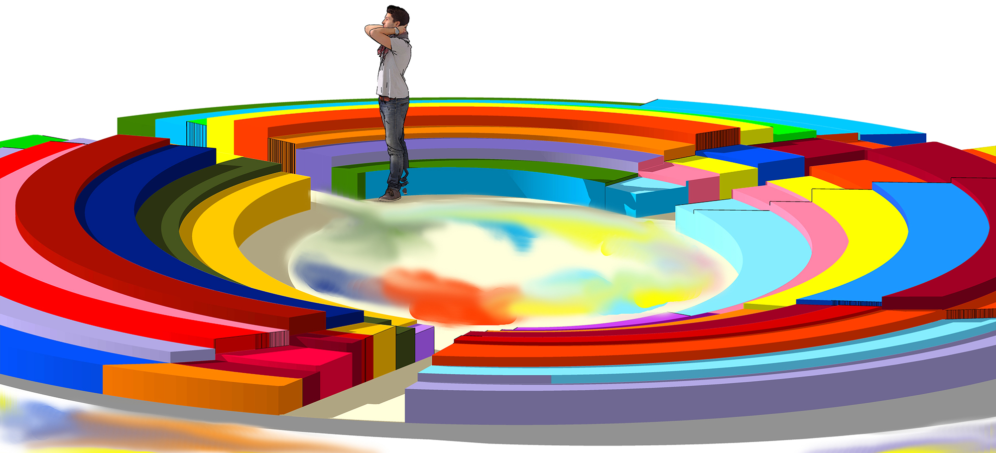 „Arena of color” visualization. Side view. „Arena of color” is a temporary art installation that is a combination of visual arts, sensual stimuli and elements of unique design. It is intended to stimulate the imagination of viewers-participants and can be a place of reflection and relaxation for the local community and certainly an attraction for tourists. Its characteristic and at the same time interactive element will be dozens of tons of colored aggregate of different gradations from 0.3 mm to 5 mm as the project is a fusion of spatial plastic composition and directly related tactile sensations. This composition contains some sculptural elements, dynamizing the form of the whole, which, combined with a rich color palette, should positively tune the viewer’s mind and make him reflect on the accompanying potential play with the colorful aggregate.